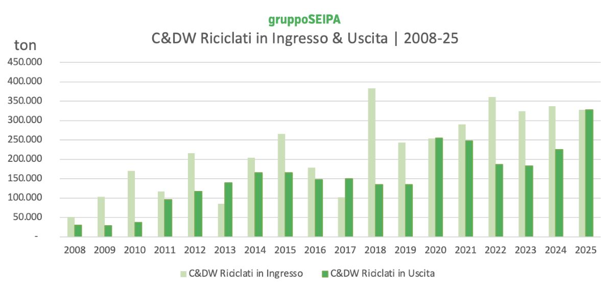 Nel 2025 la produzione di aggregati riciclati da rifiuti da costruzione e demolizione (C&DW) ha superato le 320 mila tonnellate, segnando un livello di scala industriale significativamente superiore rispetto alle prime sperimentazioni del percorso circolare avviato nel 2008.