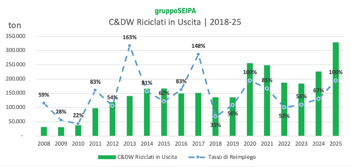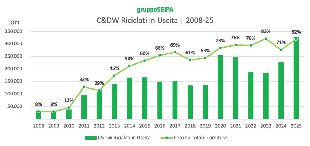 Nel periodo 2020–2025 il Gruppo Seipa ha mantenuto un tasso medio di reimpiego del 77%, mentre il 75% dei materiali in uscita dagli impianti è di natura riciclata, segno di una crescente integrazione dei processi circolari nella filiera produttiva.